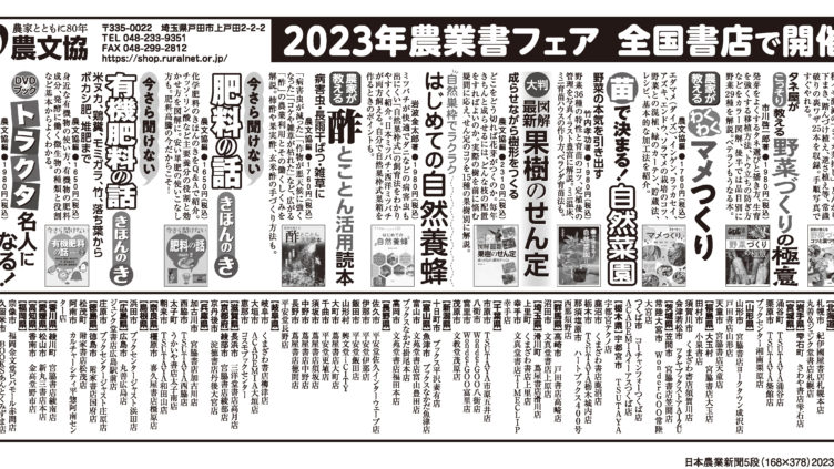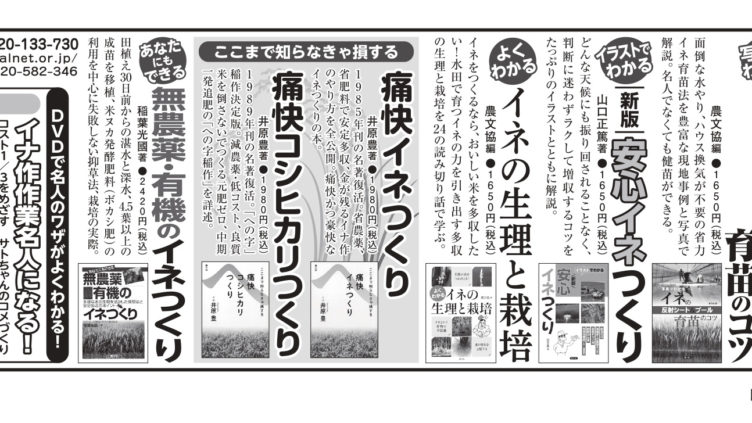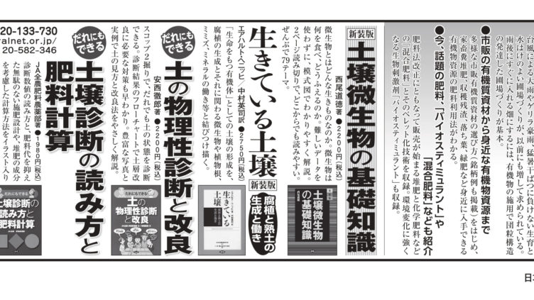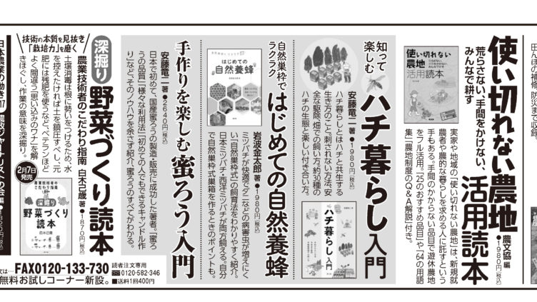 ■日本農業新聞掲載お求めはお近くの書店、または「田舎の本屋さん」へ・「大地の再生」実践マニュアル ・農家が教える 農家の土木・使い切れない農地活用読本・知って楽しむ ハチ暮らし入門・自然巣枠でラクラク はじめての自然養蜂・手作りを...