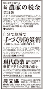 【広告】地方紙連合1/20-掲載 地方紙 2024.01.20 ■農文協 新刊お求めはお近くの書店、または「田舎の本屋さん」へ・知らなきゃ損する 新 農家の税金(第21版)・自分で地域で 手づくり防災術 土砂崩れ、洪水、地震に備える・農家日記 2024年版