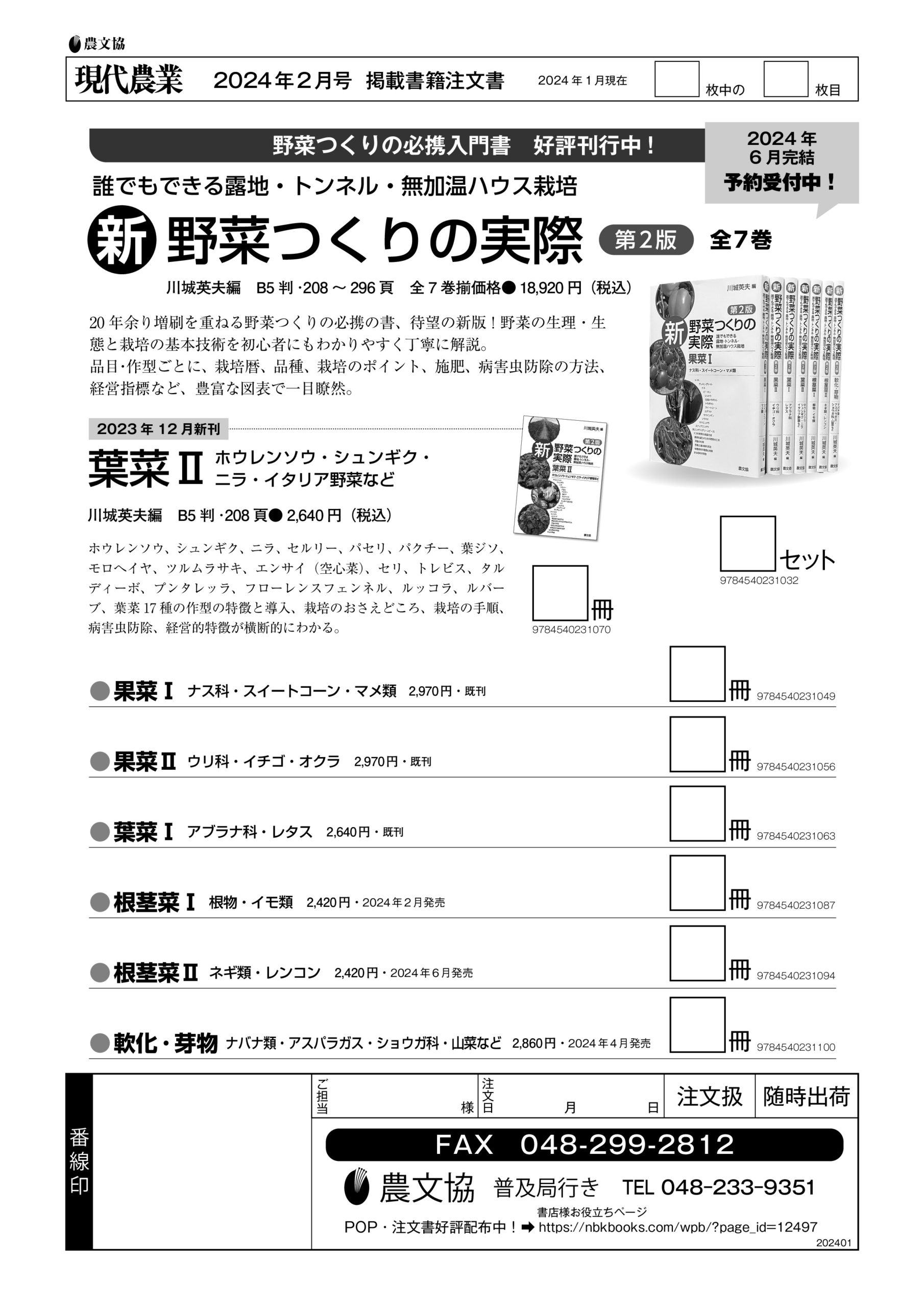 「現代農業 2024年3月号」で紹介されている本 注文書 2024.03.052024.02.01 ・最新農業技術 野菜 Vol.16・農家が教える よもぎづくし・続 農家の法律相談・カンキツ大事典 ほか 現農注文書202403ダウンロード