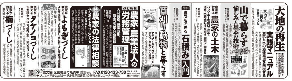 【広告】日本農業新聞4/27掲載 日本農業新聞 2024.05.022024.04.27 ■日本農業新聞掲載お求めはお近くの書店、または「田舎の本屋さん」へ・「大地の再生」実践マニュアル・山で暮らす 愉しみと基本の技術・農家が教える 農家の土木・草刈り動物と暮らす・改訂新版 農家・農業法人の労務管理・続 農家の法律相談 よくあるトラブルQ&A・農家が教える よもぎづくし・農家が教える タケノコづくし・農家が教える 梅づくし