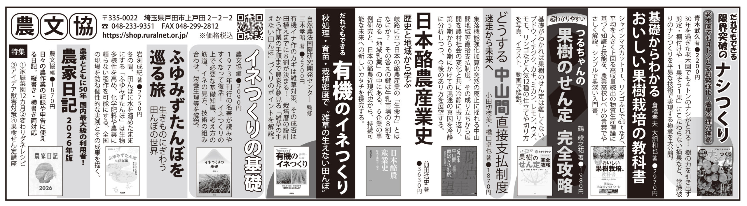 【広告】日本農業新聞11/5 掲載 日本農業新聞 2025.12.052025.11.05 ■日本農業新聞掲載お求めはお近くの書店、または「田舎の本屋さん」へだれでもできる 限界突破のナシつくり基礎からわかる おいしい果樹栽培の教科書超わかりやすい つるちゃんの 果樹のせん定完全攻略どうする中山間直接支払制度日本酪農産業史だれでもできる 有機のイネつくりイネつくりの基礎(復刊)ふゆみずたんぼを巡る旅農家日記2026年版