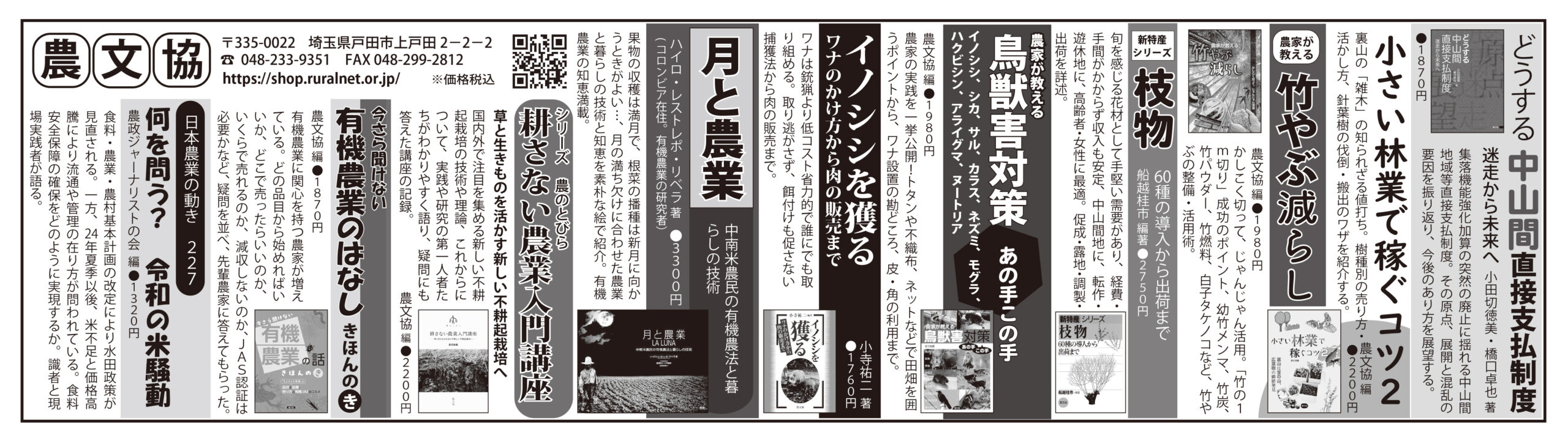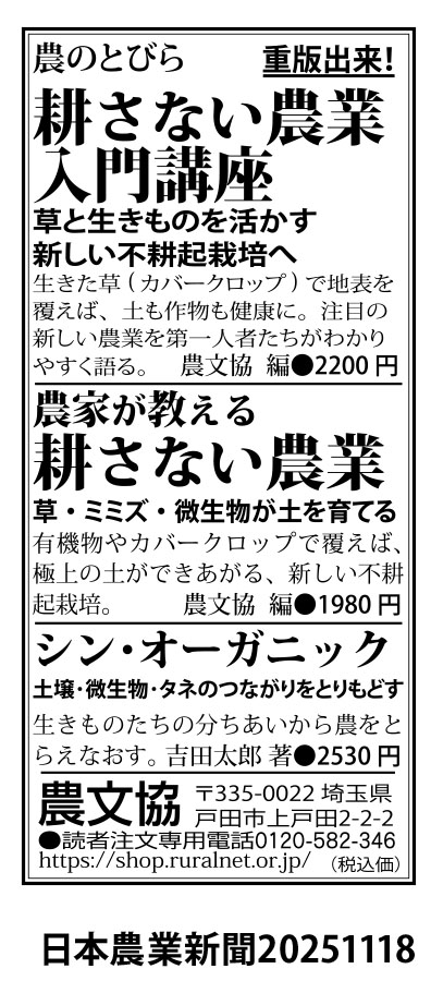 【広告】日本農業新聞11/18 掲載 日本農業新聞 2025.12.052025.11.18 ■日本農業新聞掲載お求めはお近くの書店、または「田舎の本屋さん」へ 耕さない農業入門講座 農家が教える 耕さない農業 シン・オーガニック