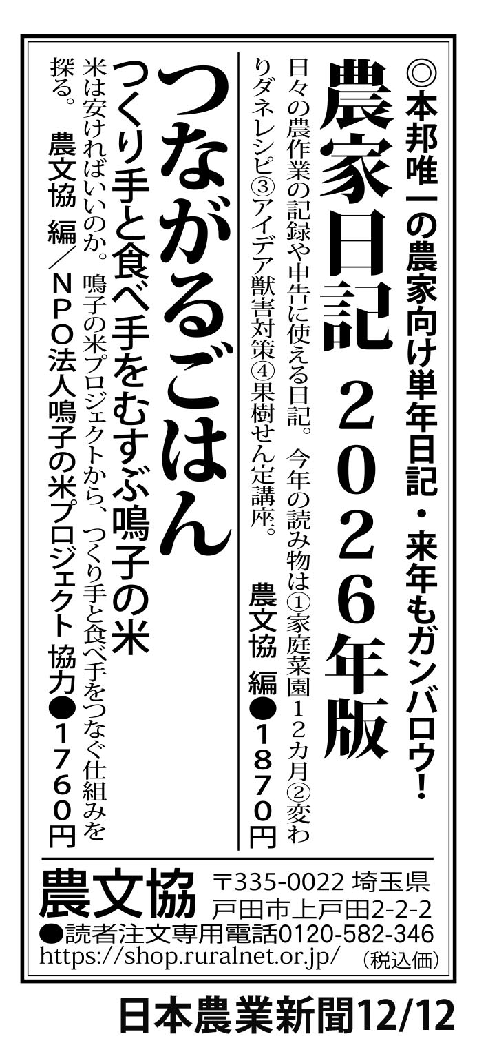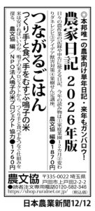 【広告】日本農業新聞12/3 掲載 日本農業新聞 2025.12.052025.12.03 ■日本農業新聞掲載お求めはお近くの書店、または「田舎の本屋さん」へ 農家日記 2026年版 つながるごはん つくり手と食べ手をむすぶ鳴子の米