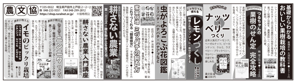 【広告】日本農業新聞2/18 掲載 日本農業新聞 2026.02.202026.02.18 ■日本農業新聞掲載お求めはお近くの書店、または「田舎の本屋さん」へ 基礎からわかる おいしい果樹栽培の教科書超わかりやすい つるちゃんの 果樹のせん定完全攻略農家が教える ナッツ&ベリーつくりじゃんじゃん使える レモンづくし虫がよろこぶ花図鑑蜜量倍増 ミツバチの飼い方農家が教える 耕さない農業耕さない農業入門講座農家が教える わくわくニンニクつくり農家が教える イモのビックリ栽培