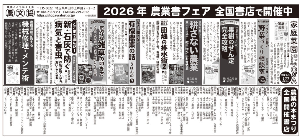 【広告】日本農業新聞2/13 掲載 日本農業新聞 2026.03.052026.02.13 ■日本農業新聞掲載お求めはお近くの書店、または「田舎の本屋さん」へ 家庭菜園 困ったときのQ&Aズバリ解決! ドクター古藤の野菜づくり相談室超わかりやすい つるちゃんの 果樹のせん定完全攻略農家が教える 耕さない農業農家が教える 田畑の排水術2今さら聞けない 有機農業の話 きほんのき農家が教える 厄介な雑草の叩き方新・石灰で防ぐ病気と害虫農機具屋が教える 機械修理・メンテ術